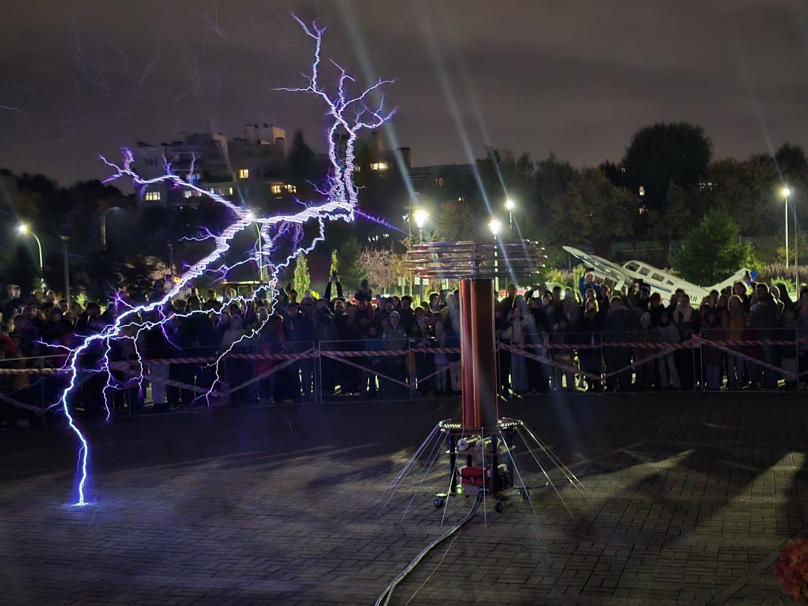 Najbardziej wyczekiwaną atrakcją Nocnych Spotkań z Nauką był „Teatr wysokich napięć”. Do tego widowiskowego spektaklu wykorzystany został jeden z największych w swojej klasie transformatorów Tesli. Kilkumetrowe wyładowania, które w rytm muzyki rozświetlały mrok, wzbudziły zachwyt widowni.